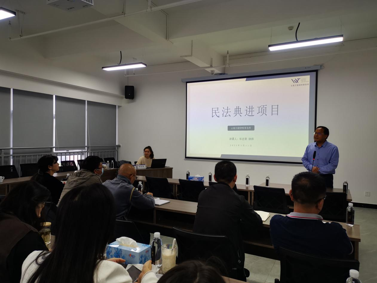 5月13日及5月18日,云南萬捷律師事務所副主任畢志榮律師到朝朝暮暮、崗頭村項目開展“民法典關(guān)于民事活動的基本原則、基本權(quán)利、基本要求”知識培訓。畢志榮律師圍繞習近平總書記對《民法典》的重要指示精神,以民法典的基本規(guī)定、民事主體、民事權(quán)利、民事法律行為、民事責任、訴訟時效為主線,從多個角度對《民法典》內(nèi)容進行了深入淺出的解讀,并通過生動的案例對《民法典》中相應的規(guī)定進行重點宣講。同時,結(jié)合《民法典》的理論創(chuàng)新和立法變化對房地產(chǎn)企業(yè)在日常工作中的相關(guān)法律風險防范知識進行了提示講解,為全體干部職工帶來了一堂生動的普法課。