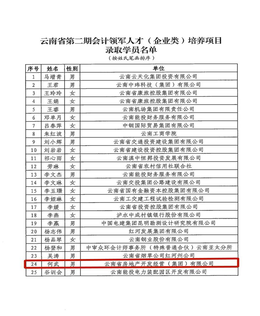 近日,云南省財(cái)政廳、中共云南省委組織部、云南省人力資源和社會保障廳發(fā)布關(guān)于錄取云南省第二期會計(jì)領(lǐng)軍人才培養(yǎng)項(xiàng)目錄取學(xué)員名單,大業(yè)公司財(cái)務(wù)總監(jiān)何武經(jīng)過報(bào)名推薦、資格審查、材料審核、筆試、面試和公示等環(huán)節(jié)嚴(yán)格選拔,成功入選會計(jì)領(lǐng)軍人才培養(yǎng)項(xiàng)目。