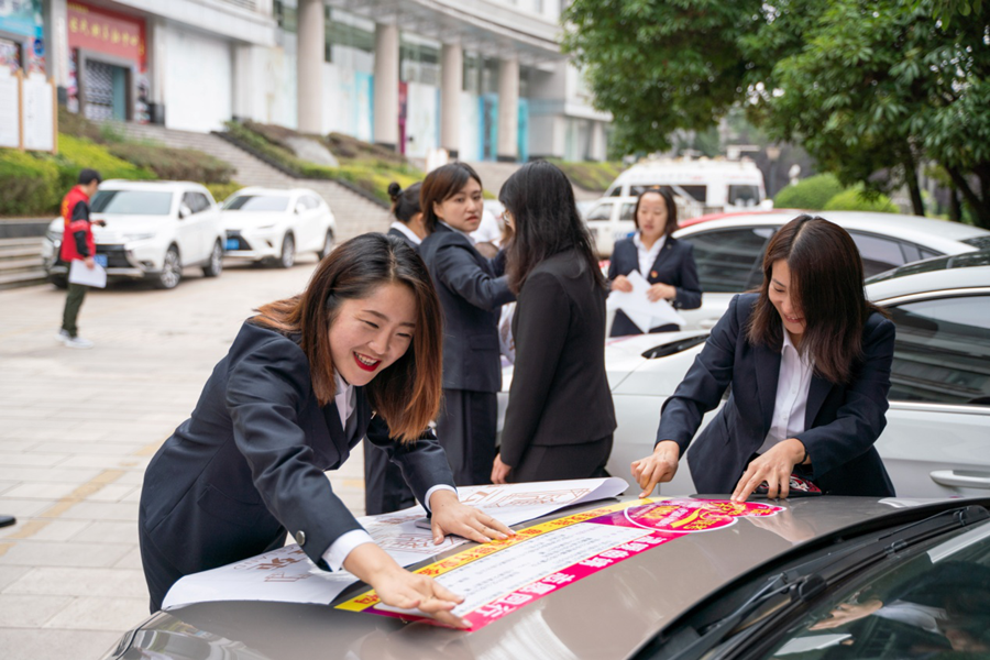 現(xiàn)場(chǎng),大家為愛心送考車粘貼上了玫紅色的“愛心送考”車標(biāo)。啟動(dòng)儀式結(jié)束后,公司的2輛愛心送考車跟隨車隊(duì)沿著麒麟南路廣電大樓、錦怡花園酒店門口、曲陸苑紅綠燈、南城門廣場(chǎng)、麒麟花園路線游行。