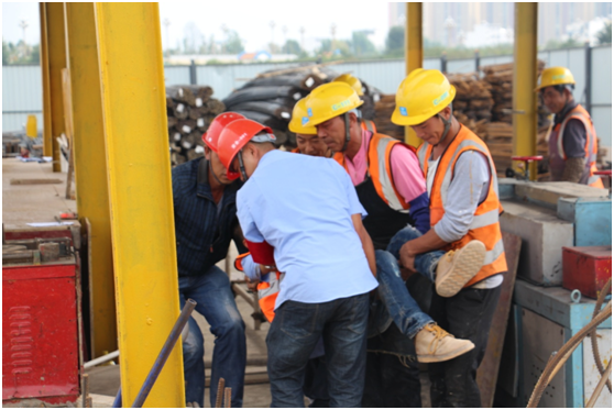 上午10時演練開始。鋼筋加工車間工人們正緊張有序地進行生產(chǎn),突然彎箍機處傳來“嘭”的一聲。副指揮長接到報告:“二標段鋼筋加工棚發(fā)生一起事故,事故原因不明……”。應急救援指揮小組在接到報告后,立即趕往事發(fā)地點并啟動項目緊急預案,組織人員進行應急救援。隨后,醫(yī)療救援組到達現(xiàn)場,立即采取“口對口人工呼吸法”和“心臟胸外擠壓法”對觸電人員急救(人工呼吸和胸外按壓方法);立即向120急救中心求助,報告事故地點和基本情況。緊接著,疏散警戒組警戒聯(lián)絡組員在組長指導下迅速拉起警戒線,引導周圍工人撤離到安全區(qū)并疏散圍觀人員,既杜絕了二次觸電的可能也為現(xiàn)場救護提供了足夠的場地。