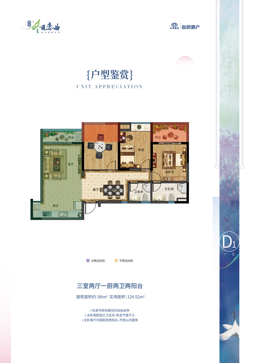 D1戶型86㎡3房2廳1廚2衛(wèi)+2陽臺(tái)=124.52㎡