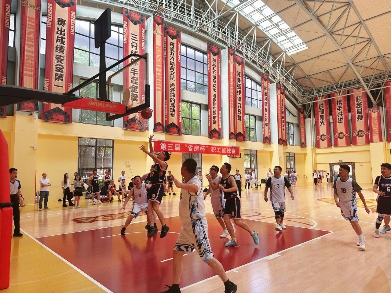10時,比賽隨著裁判員一聲哨響,公司黨委副書記、董事長魏成凡為此次首發(fā)隊伍比賽開球。 首日比賽,各參賽隊員頑強拼搏,不畏強手,運動員們精神抖擻,配合默契,傳球、運球、投籃,動作行云流水,一氣呵成。他們的身姿矯健而靈活,在籃球場上翻騰、跳躍。比賽中,球員們?nèi)橥度耄瑹嵫序v,你來我往,比分緊咬,默契的配合,精彩的攻防贏得現(xiàn)場觀眾陣陣歡呼,隊員們舉手投足間傳遞著彼此信任,團結拼搏中彰顯著省房精神。