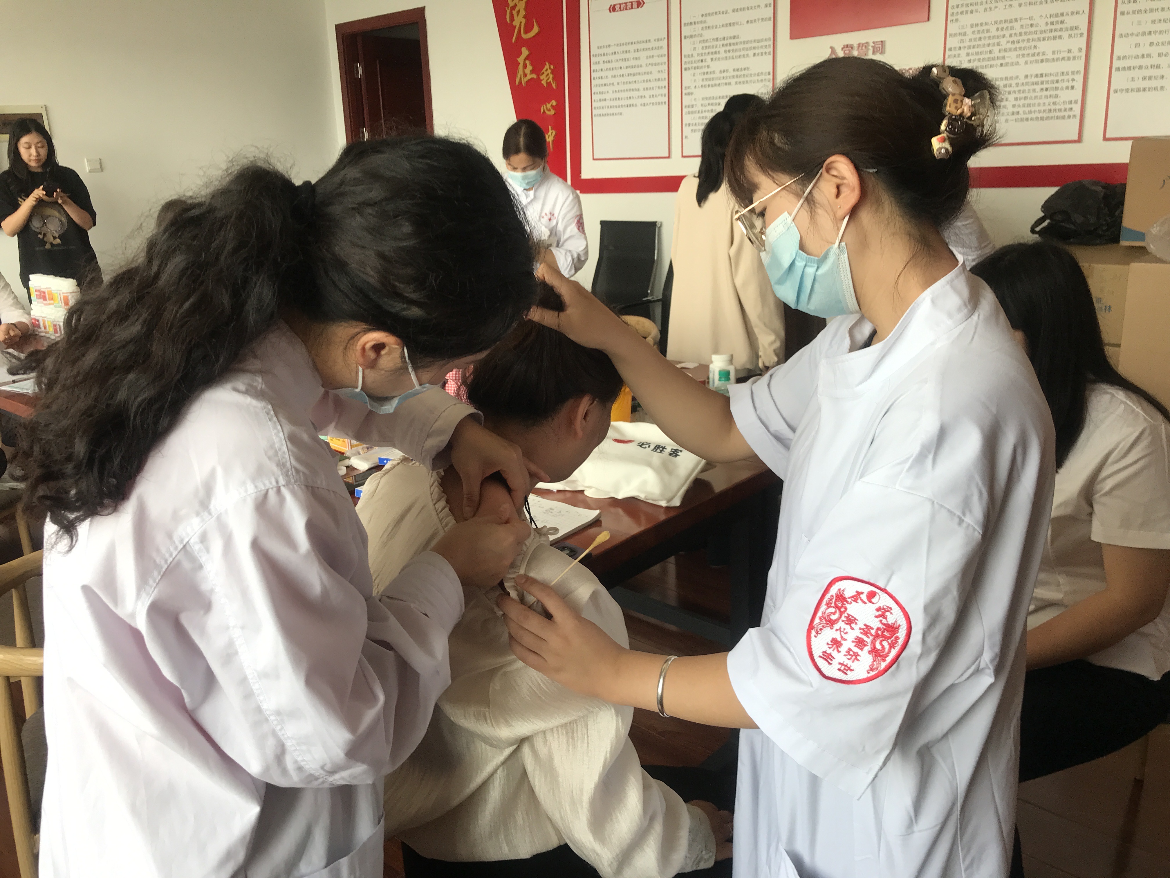 義診活動現(xiàn)場,來自圣愛中醫(yī)館的多名醫(yī)療專家,為職工免費(fèi)提供各種疾病及亞健康疾病的把脈辯證,開展血壓血糖測量、肩頸緊繃等職業(yè)疾病的推拿調(diào)理、針灸服務(wù),講解熱伏天的保健、養(yǎng)生知識。同時提供冬病夏治三伏貼、酸梅湯、季節(jié)大鍋茶等愛心服務(wù)。