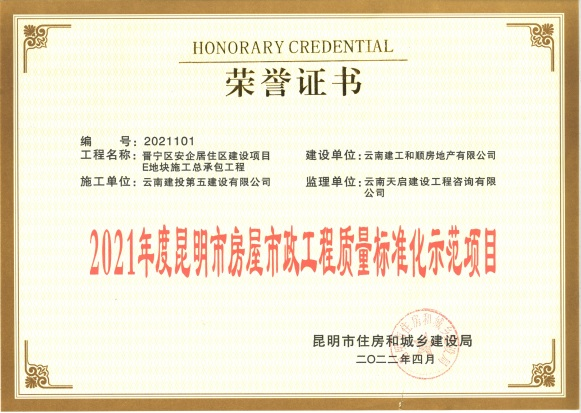 近日,由和順公司開發(fā)建設(shè)的安居和苑項(xiàng)目,獲昆明市住房和城鄉(xiāng)建設(shè)局頒發(fā)的“2021年度昆明市房屋市政工程安全生產(chǎn)標(biāo)準(zhǔn)化工地”和“2021年度昆明市房屋市政工程質(zhì)量標(biāo)準(zhǔn)化示范項(xiàng)目”榮譽(yù)證書。
