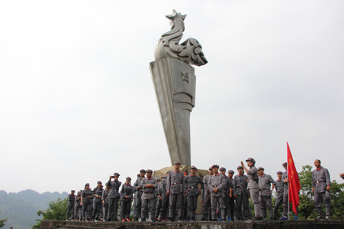 在路程近5公里、歷時近1小時的“重走長征路”體驗教學(xué)中,全體參訓(xùn)學(xué)員身穿紅軍服裝,排著整齊的隊伍,從當年紅軍進入威信縣扎西鎮(zhèn)的位置出發(fā),沿著蜿蜒崎嶇、高低起伏山澗小道,踏著當年紅軍戰(zhàn)士的足跡,重新走過這段承載著偉大歷史意義的長征路。夏日的扎西鎮(zhèn),雖然剛下了雨,依然暑氣不減,高低起伏的山路,加上隊員們的“你追我趕”,汗水濕透了衣背,但大家依然熱情高漲,用雙腳體驗著長征的艱辛困苦,用心靈感受著那段波瀾壯闊的歷史。