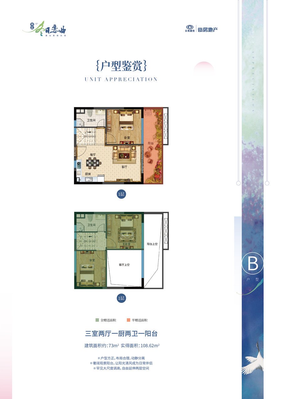 B戶型73㎡3室2廳1廚2衛(wèi)+1陽臺(tái)=108.62㎡